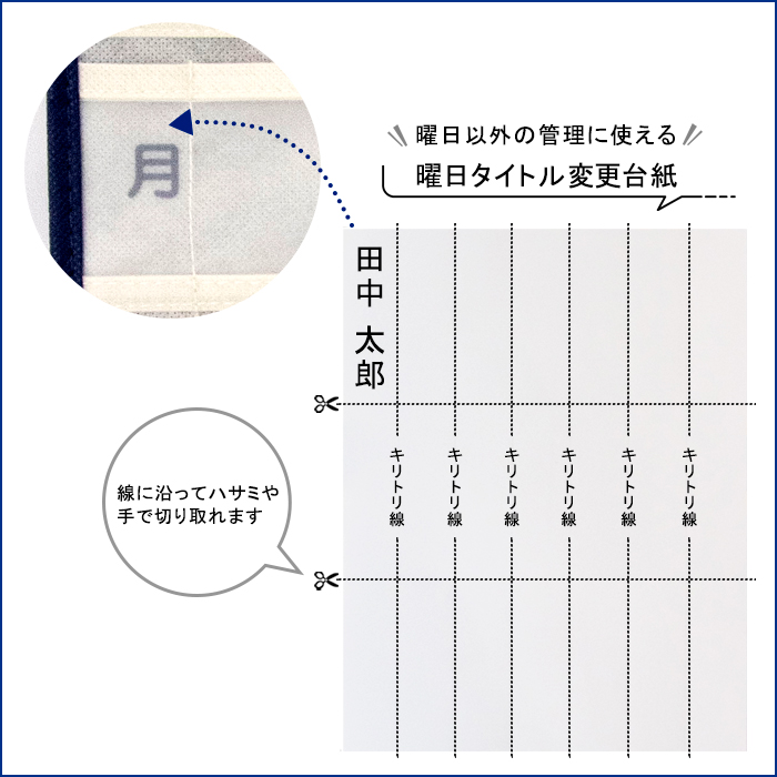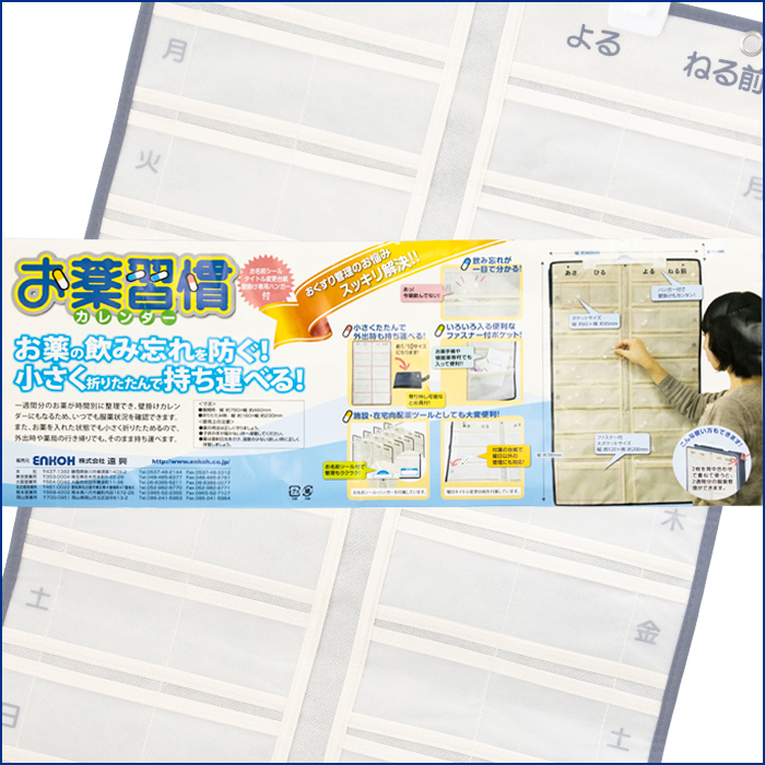 お薬の飲み忘れを解消! 一週間分のお薬を整理できる壁掛けレンダー ・小さく折りたためて持ち運びに便利 ・曜日やタイトルを変更できる台紙付き ・カンタン、壁掛けハンガー、お名前シール付き サイズ:縦780mm、幅460mm(折り畳み時:160mm x 230mm) 1マスサイズ:幅85mm、深さ65mm |