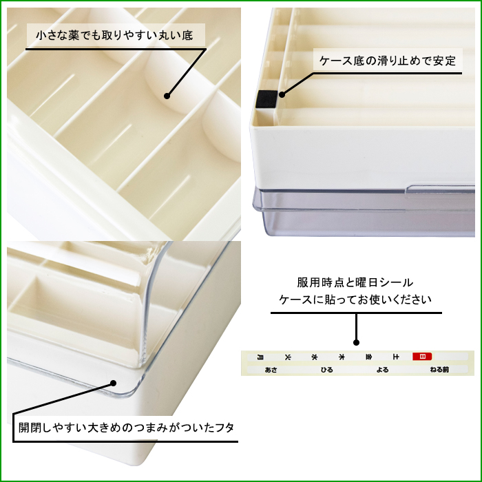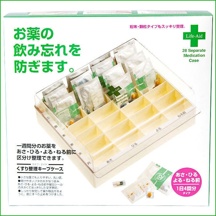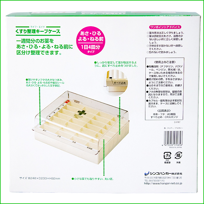 くすり整理キープケース(5ケース) ・一週間分のお薬をあさ・ひる・よる・ねる前に分別して整理できます ・取り出しやすい丸底仕様 ・底に滑り止め付き ・曜日、時間シール付き サイズ:幅248mm、奥行233mm、高さ92mm 素材:上ぶた、本体 AS樹脂 |