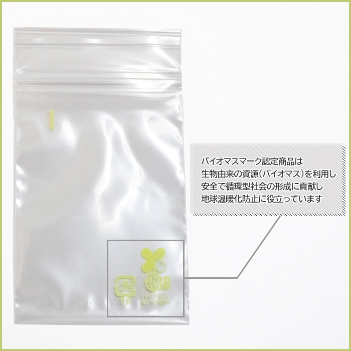 株式会社 生産日本社 はたらく チャック袋たち セイニチ グリップス 「ユニパック®バイオ E-チャック®」 環境に配慮した新たなユニパック「バイオ」登場 ●従来品と比較し、CO2排出量を約20%削減 ●環境対応型インクを採用 ●食品衛生法の容器包装規格(平成18年厚生労働省告示第201号)試験に適合 ●食品由来の原料を30%配合、石油資源の節約とCO2削減に貢献 ★バイオマスマーク取得 バイオマスマーク認定商品は、生物由来の資源(バイオマス)を利用して 安全で循環型社会の形成に貢献し、地球温暖化防止に役立っています。 品番:EA-4(チャック下:70mm 袋巾:50mm 厚み:0.04mm) 1ケース入り数(枚): 12000枚 1袋 100枚 |