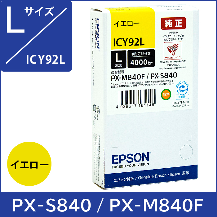 【エプソン】純正インク 消耗品 > ICY92L エプソン EPSON 純正インク Lサイズ【イエロー】 対応機種:PX-S840 PX-M840F