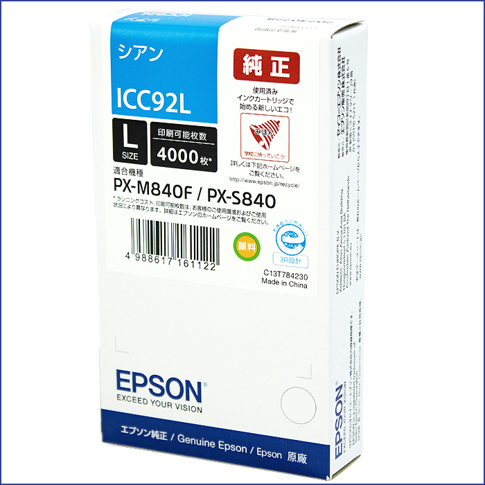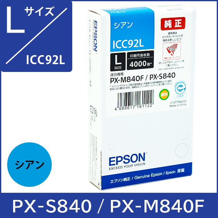 【エプソン】純正インク 消耗品 > ICC92L エプソン EPSON 純正インク Lサイズ【シアン】 対応機種:PX-S840 PX-M840F