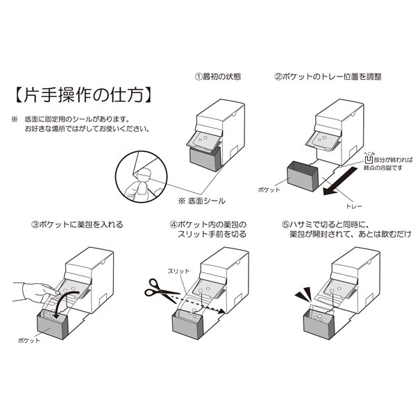 【使用方法】 一包化した薬包を切らずに束ねて、お薬束®に入れます。 後は、開閉部から一日分を引き出しセット完了。 使用するときは一日分を引き出し、スロープのエッジに沿って切れば服用ができます。 ハサミを使って、片手で操作も可能!自助具としてもお使いいただけます 組立不要!送られてきて、薬を充填すれば、すぐに使える♪ 【特徴】 ・約1ヶ月分を切らずに束ねて充填 ・置き場所も自由に選べる ・紙製なので手軽に始めやすいコストパフォーマンス 【仕様】 ・サイズ:(幅)7.5cm×(奥行)16.9cm×(高さ)12.3cm (組立時) ・材質 :紙 ・色 :ピンク・ブルー・グリーン ・入数 :3個 ・製造元:株式会社 サンポーウェルズ 【よくあるご質問】 Q:紙だとどれくらいの期間使用できますか? A:厚さは1.5mmあります。現在症例数は少ないですが、6ヶ月以上使用されています。 衛生面の観点から一定期間での交換をお勧めいたします。 滋賀県の「新商品生産等による新事業開拓者認定制度の認定」2020年4月15日認定 滋賀県HP |