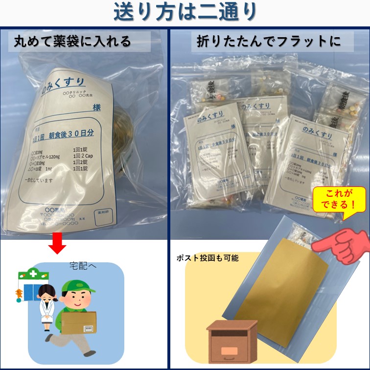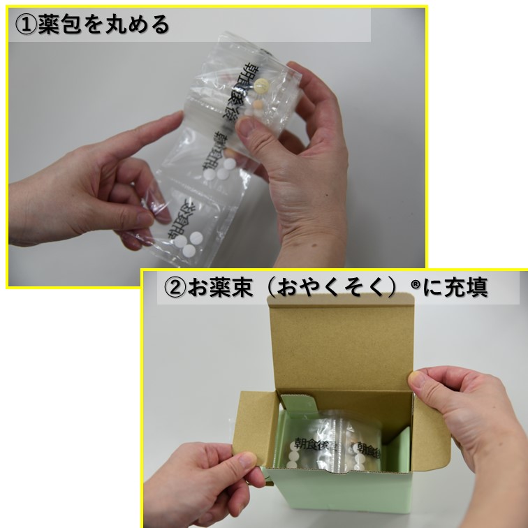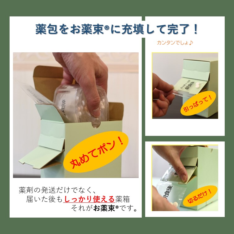 <お薬束®の始まり> 始まりは種苗のケースを30日分に切ったお粗末な物でした。 それでも患者さんは、笑顔で「ありがとう」といって使ってくれました。 それが嬉しくて、このお薬束の研究が始まりました。 自分の生き方や生活に、薬を合わせる。 薬に縛られない生活を皆さんに過ごしていただきたい。 そんな思いで「お薬束®」(おやくそく)を作りました。 ぜひ、皆様にもご実感下さり、毎日の負担が少しでも和らぎますことを願っております。 (株)サンポーウェルズ りぼん薬局 <患者様に伝えたいこと> ![]() お薬を飲むために ・わざわざ歩いていませんか? ・一包ずつ自分で詰めていませんか?こぼれてしまった!て、事はありませんか? ・「薬どこやったかな?」と、場所が定まらず探していませんか? お薬束®は約1ヶ月分充填でき、置きたいところに置けます。 飲むときに1回分を引っ張って切るだけ。 食卓に置いて食後のルーティンに。寝室に置いて寝る前に。家事の始めに台所で服用。飲む時も場所も自分で決める。それがお薬束®です。ライフワークに合わせた服用を。 「薬に縛られず、目的でなく手段となり快適な生活を送られること」を願っております。 <薬局の方に伝えたいこと> ・「ほら、今回は飲み残し無かったぞ!」と、自慢げに持ってきて頂く患者さんもおられます。 ・お薬束®を「どこに置いておられますか?」と、聞くと「食後に飲めるようにテーブルに置いておくと、忘れない」そうです。 それがご自分の意識付けになっておられるようですね 確かに、残薬は減っているようです。 患者さんとのコミュニケーションとしても役立ち、少しですが、アドヒアランスってこういうことか!と、気づかされています。 ・在宅で「朝夕食後と並べると、日付がずれると飲み忘れに気づける」と、おっしゃって頂けます。 訪問看護師さんからも、「ご自分で飲めるようになった」と喜んで下さいました。 ご自身で飲まれる方にはアドヒアランス向上に、介護の方には、介護のお手伝いになれば幸いです。 もちろん、お薬束®を断られた患者さんもおられますが、現在当局では、30人ほどにお声がけして、20人以上の方にご使用を継続して頂いています。 ハサミを使って、片手で操作も可能!自助具としてもお使いいただけます。 ※お届け時、ポスト投函となります。 こちらからお薬束®の活用事例集をご覧いただけます。 オンライン服薬指導でお薬束®を活用する動画が公開されました。 |